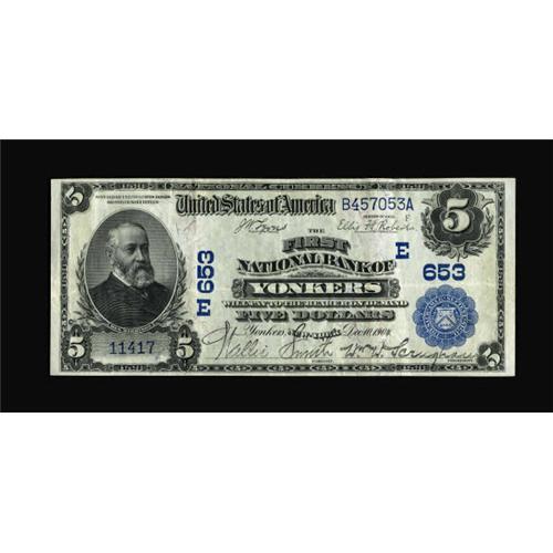 <B>Yonkers, NY</B></I> - $5 1902 Date Back Fr. 590 <B>The First NB</B></I> Ch. # (E)653<BR> A far above average example from this much collected Westchester County bank. Bright <B>Very Fine+++.</B></I><BR><I>From The Thomas A. Bergin Collection</B></I><BR><BR><b>Shipping:</b> Coins & Currency (<a target="_blank" href="http://www.heritageauctions.com/common/shipping.php">view shipping information</a>)