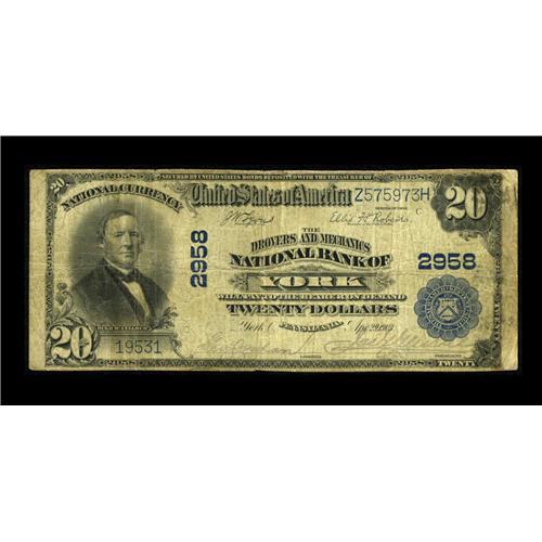 <B>York, PA</B></I> - $20 1902 Plain Back Fr. 650 <B>The Drovers & Mechanics NB</B></I> Ch. # 2958<BR>This community once hosted a major manufacturing installation of the now defunct Allis-Chalmers Corporation, where components to be incorporated in nuclear submarines were fabricated. This <B>Fine</B></I> addition to the census is only the fourth $20 Plain Back to surface from this issuer.<BR><BR><b>Shipping:</b> Coin/Currency (<a target="_blank" href="http://www.heritageauctions.com/common/shipping.php">view shipping information</a>)