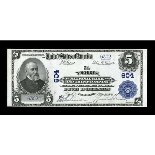<B>York, PA</B></I> - $5 1902 Plain Back Fr. 598 <B>The York NB & TC</B></I> Ch. # 604<BR>The paper here is bright and the stamped signature remain strong. <B>Crisp Uncirculated.</B></I><BR><BR><b>Shipping:</b> Coins & Currency (<a target="_blank" href="http://www.heritageauctions.com/common/shipping.php">view shipping information</a>)