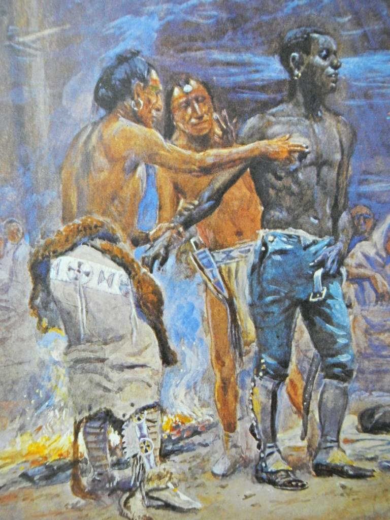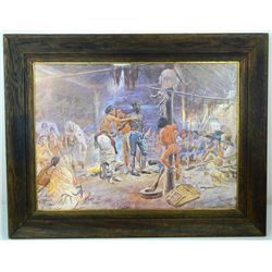 This is a print of C.M. Russells painting, York, which depicts an incident of Lewis & Clarke's that occurred in the winter of 1804-05 at the Mandan villages on the Upper Missouri. The Mandan had never seen a black person before and were fascinated with York’s skin color, even at one point trying to rub it off. Of all the members of the Corps, the Indians particularly admired York for his unusual appearance and physical prowess. This painting was done in 1908. Russell is arguably the most iconic Western Artist and this is a great example of his work. Great Americana, Lewis & Clarke, Western, and Black Americana Collectible print. This print appears to be on matte board. Measures 22"x28"