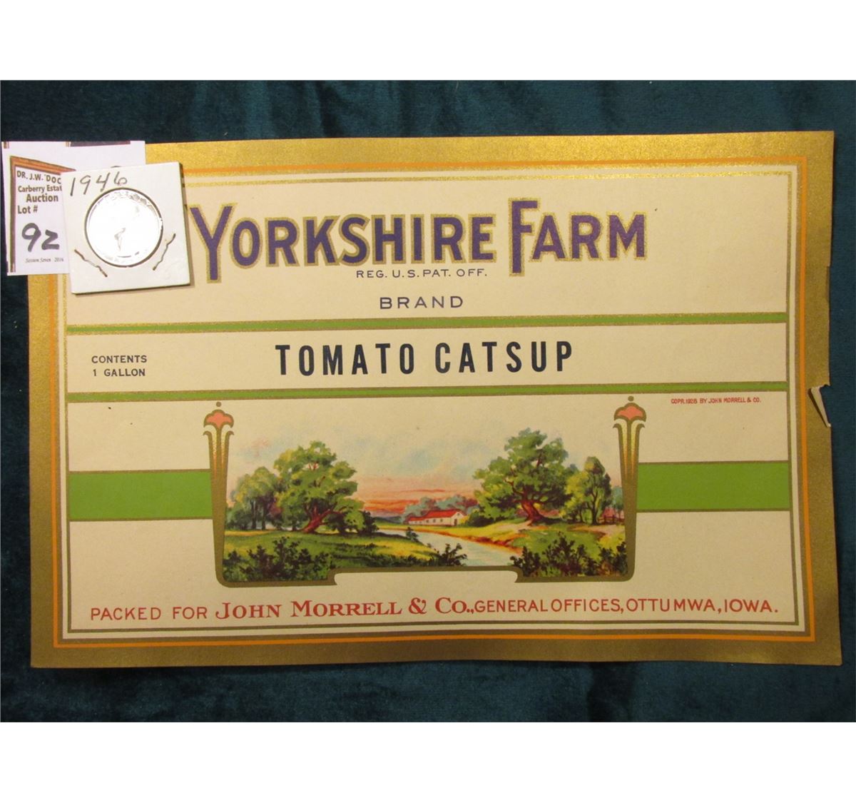 "Yorkshire Farm…Brand Tomato Catsup Packed For John Morrell & Co., General Offices, Ottumwa, Iowa" B