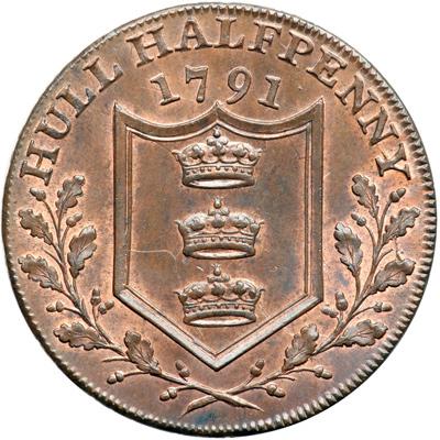 Yorkshire. Hull. Halfpenny, 1791. D&H-17. Edge: PAYABLE AT THE WAREHOUSE OF IOATHAN GARTON & CO. X. An equestrian statue of William III. Reverse: Shield of Arms. NGC graded MS-66 Red & Brown.