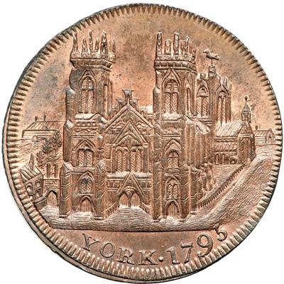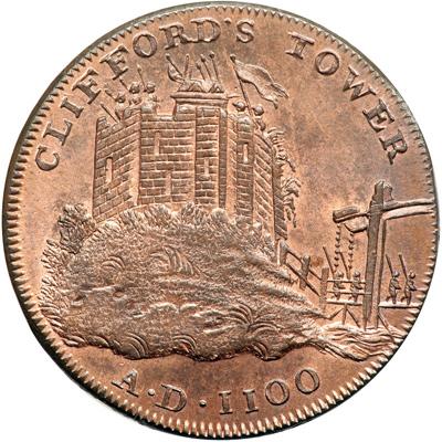 Yorkshire. York. Halfpenny, 1793. D&H-63. Edge: YORK BUILT A. M. 1223. CATHEDRAL REBUILT A.D. 1075. View of York Cathedral. Reverse: View of Castle and drawbridge. NGC graded MS-65 Red & Brown.