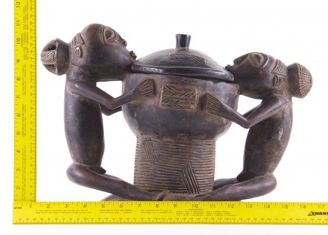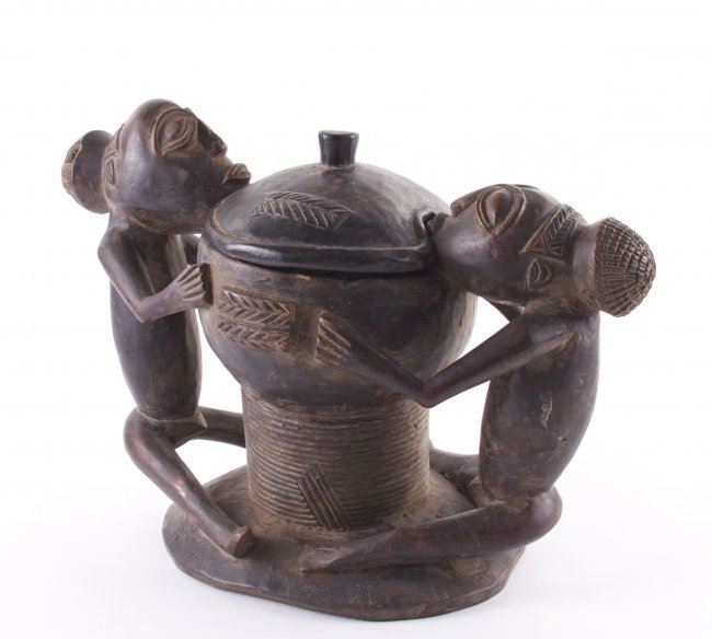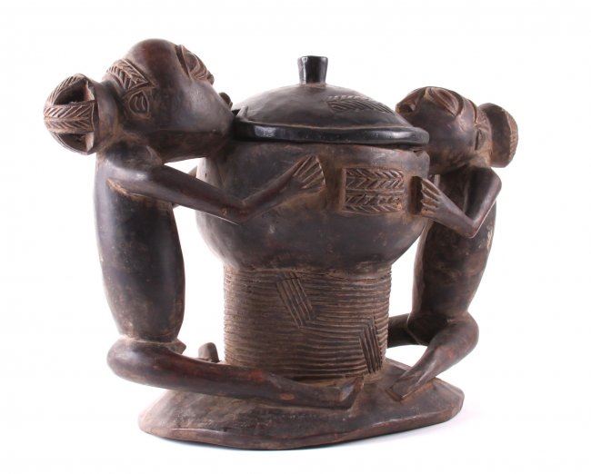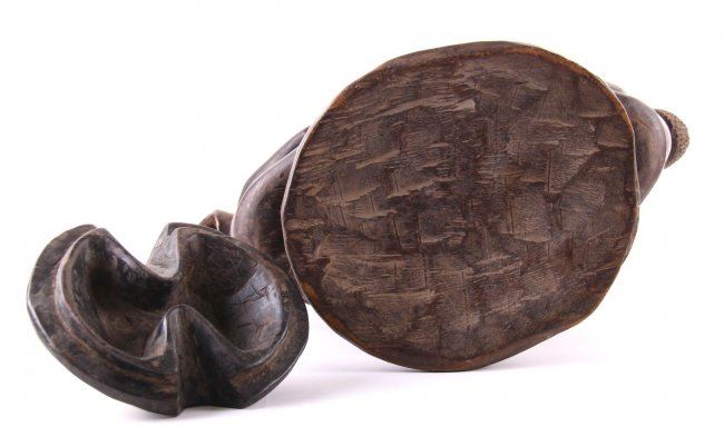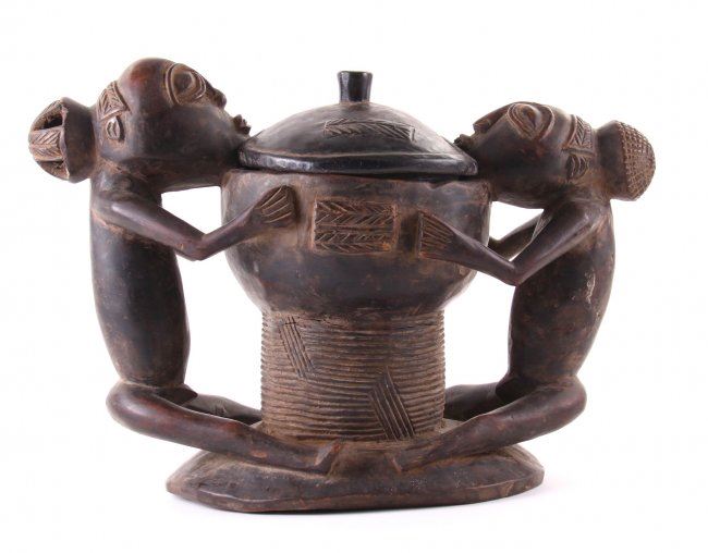 Given its ritual and aesthetic functions, it provides the Yoruba carver with a unique opportunity to display his artistic talents. Usually carved from wood and measuring between five and sixteen inches in height, a typical container is in the form of an animal or human figure bearing a small bowl. In some cases, the metaphysical attribute of a given animal motif may be used to further empower the sacred palm nuts inside the bowl. But when the motif assumes a human form, it frequently has a votive significance, especially since some are given by clients to a diviner to thank a deity for a blessing or to implore the deity to bestow more favors on the donor. Provenance: Private collection collected between 1910 and 1930.