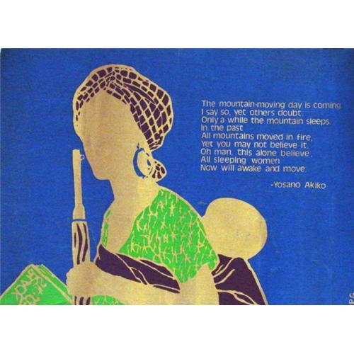MJP1682 ? Yosano Akiko - 23-1/2" x 17 - Poem by Yosano Akiko accompanying a drawing of a peasant woman holding a rifle and carrying a young child. Some ragged edges, vertical folds. Rolled.