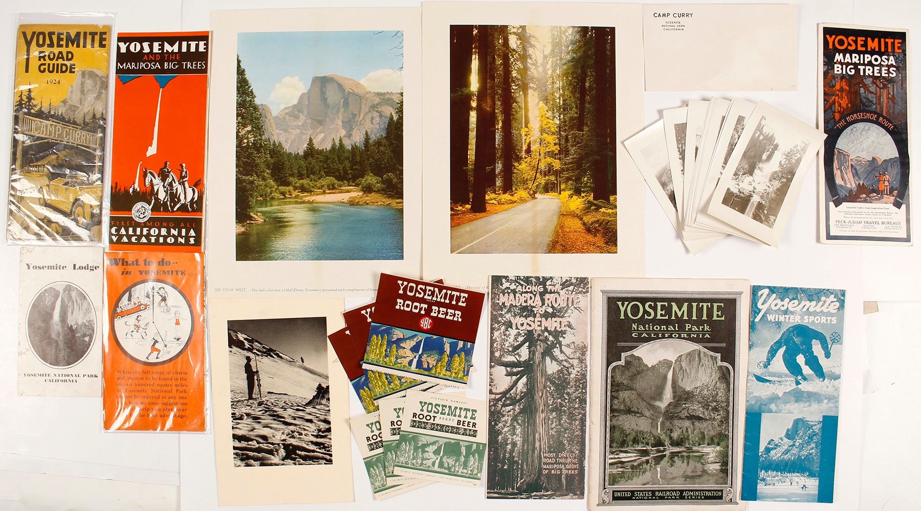 Lot of 30. Promotional guides: 1923 Yosemite Mariposa Big Trees; 1924 Yosemite Road Guide; undated for Yosemite Lodge; c.1920s "What to do in Yosemite"; c.1920s Yosemite and the Mariposa Big Trees; c.1940s Yosemite Winter Sports; undated Along the Madera Route to Yosemite; and large 1919 guide (cover detached). Other ephemera: Camp Curry cover; 6 Yosemite Root Beer labels; twelve 5.5. x 3" black and white photographs; 1947 dinner menu for The Ahwahnee; and two different 12 x 9" color prints of Yosemite by the Standard Oil Company. Please inspect. (Prag Collection) Date: Location: Yosemite, California HWAC # 55617