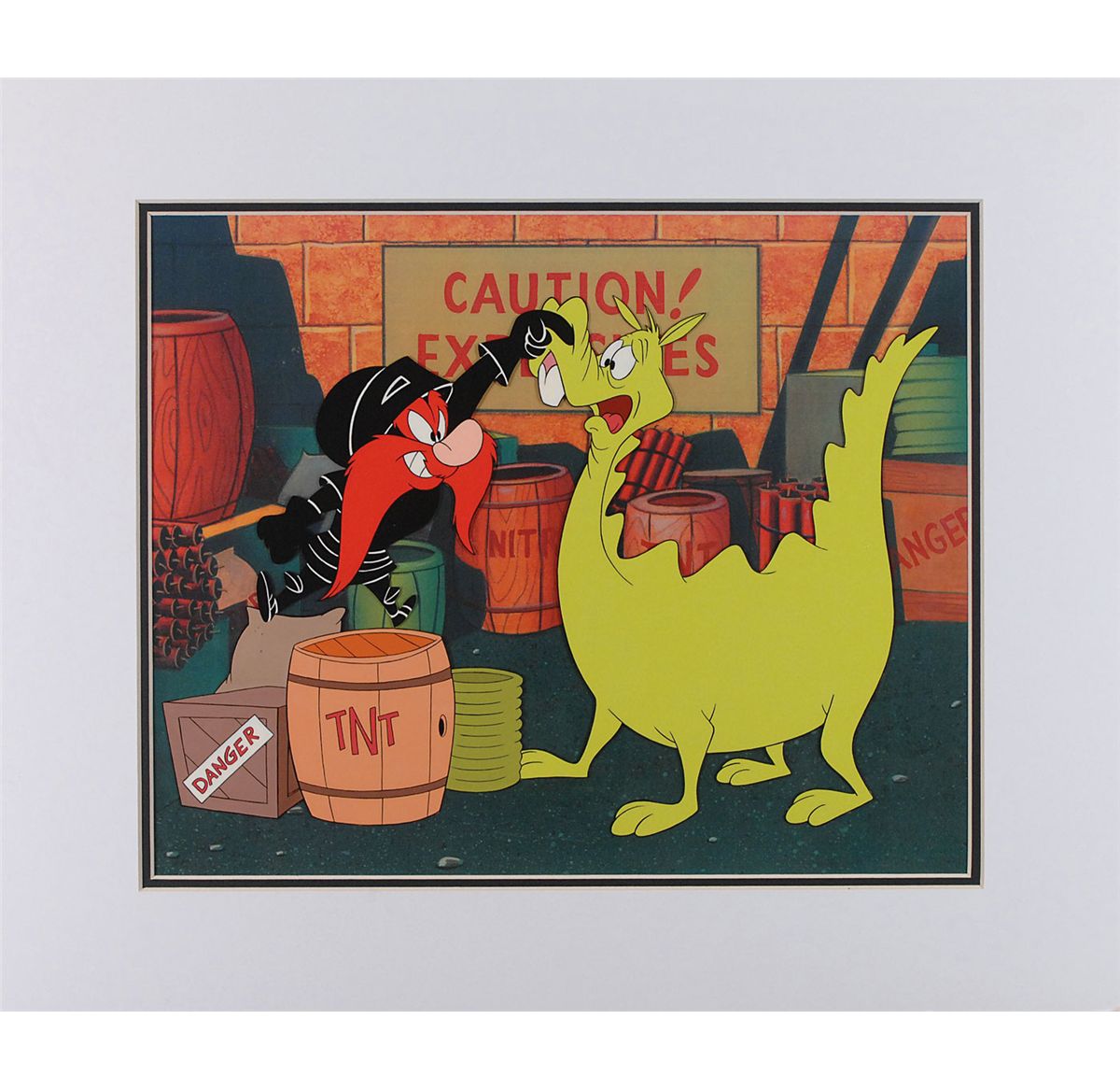 Original hand-painted Warner Bros. color model cel of Yosemite Sam and his dragon from 1958’s ‘Knighty Knight Bugs’ on a 13 x 10.5 acetate sheet, set against a pre-printed color background. Double-matted to an overall size of 18 x 15. In fine condition. Directed by Friz Freleng, ‘Knighty Knight Bugs’ was the only Bugs Bunny cartoon to win an Academy Award.