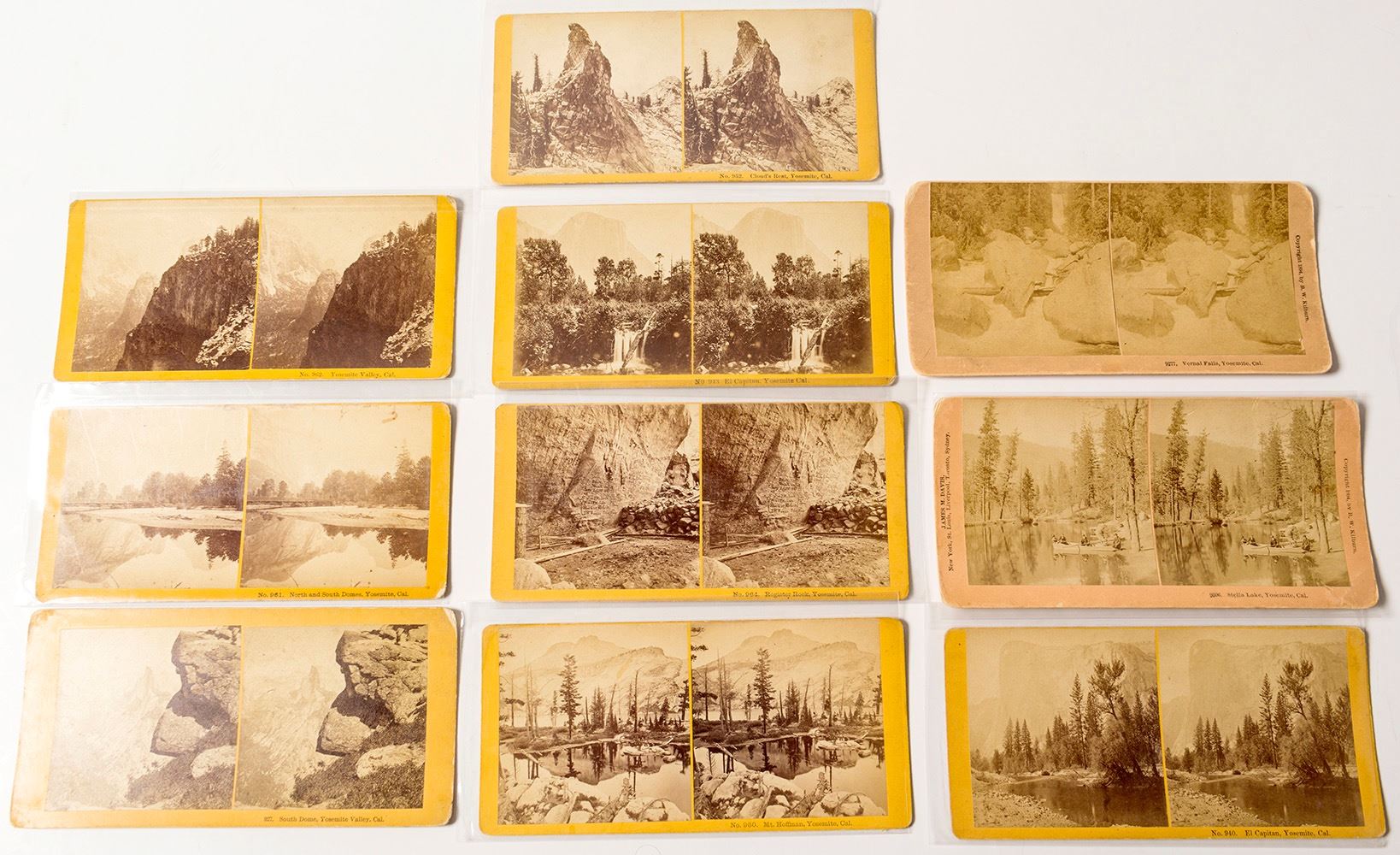 Lot of ten different stereoviews published by B.W. Kilburn (and Kilburn Bros., Littleton, NH). Rarest is No. 964--Registry Rock, nice contrast. Also included: 940--El Capitan; 943--different El Capitan; 952--Cloud's Rest; 960-- Mt. Hoffman; 961--North and South Domes; 962--Yosemite Valley; 927--South Dome; 9277--Vernal Falls; and 9306--Stella Lake. Earlier (yellow cards) have medium contrast and are good condition. Later (1890s) cards have poorer contrast. Please inspect. (Prag Collection) Date: Location: Yosemite, California HWAC # 50679