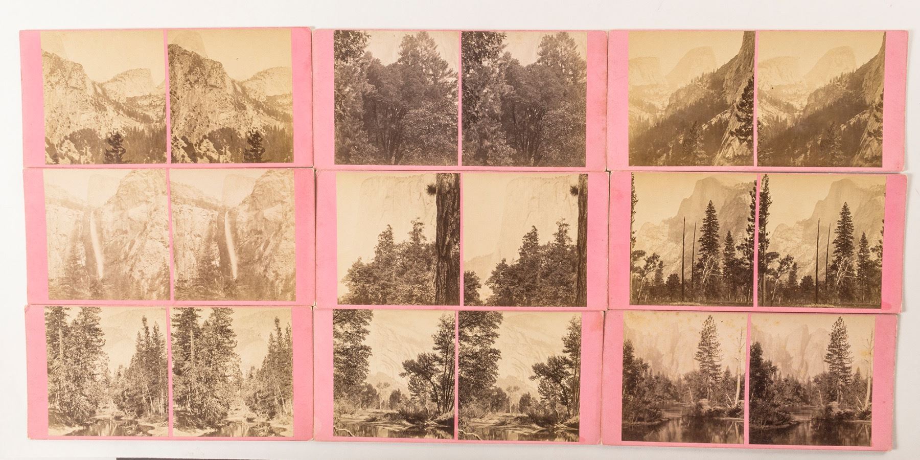 Out of the hundreds of Yosemite stereoviews in this collection, these 9 were kept separate by Prag. They were in an envelope marked Very Early Yosemite Watkins. All nine are different, mounted on pink cardstock. None show structures or hotels. The locations are hand noted on the back of each. These are likely early 1860s cards. Views include: Half Dome, Mt. Broderick from S. Fork, El Capitan, Bridal Veil, River View at Noon, North Dome, River View Down the Valley, The Top of the Yo Semite, and View from the South Fork. Light to medium contrast. According to Mautz, Watkins came to California during the Gold Rush began photographing Yosemite in 1861. He became famous when he produced his mammoth plate views. Located in San Jose in 1850s, then San Francisco. Eventually went blind and lost all of his negatives during the 1906 San Francisco earthquake. Sadly, he died in a mental institution in 1916. (Prag Collection) Date: Location: Yosemite, California HWAC # 50684
