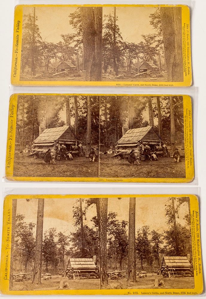 Three different rare stereoviews by John P. Soule (Boston) c.1870 of Lamon's Cabin in Yosemite. 1) No. 1245: Close-up exterior view with three men sitting outside (surely one is Lamon), smoke coming out of chimney. 2) No. 1076: Farther back exterior with someone posing outside cabin (likely Lamon). 3) No. 1075: Different pulled back exterior shot with Lamon sitting out front. Worse condition than others with staining. James Chenowith Lamon was the first pioneer settler of Yosemite. He came to Yosemite in the late 1850s and built the first log cabin, taking advantage of the homesteading. While others left, Lamon stayed in the valley for the winters of 1862 and 1863, showing other settlers that it was possible. In 1864, Lamon suddenly became a squatter on permanently public land after the Yosemite Grant was signed on June 30th. This Act of Congress protected Yosemite Valley and the Mariposa Grove for all time, giving that land to the State of California to manage. The Board of Commissioners of the Yosemite Grant offered 10 year leases to the pioneers that had claims. The rates were often as low as one dollar per year, but Hutchings convinced Lamon and couple other settlers not to sign a lease for the land that they believed was theirs. After a lengthy court battle and much publicity, mostly orchestrated by Hutchings, the State eventually bought out the remaining settlers, including Lamon’s property in 1874 at a cost of $12,000. However, Lamons died 9 months later of pneumonia. (Prag Collection) Date: Location: Yosemite, California HWAC # 50680