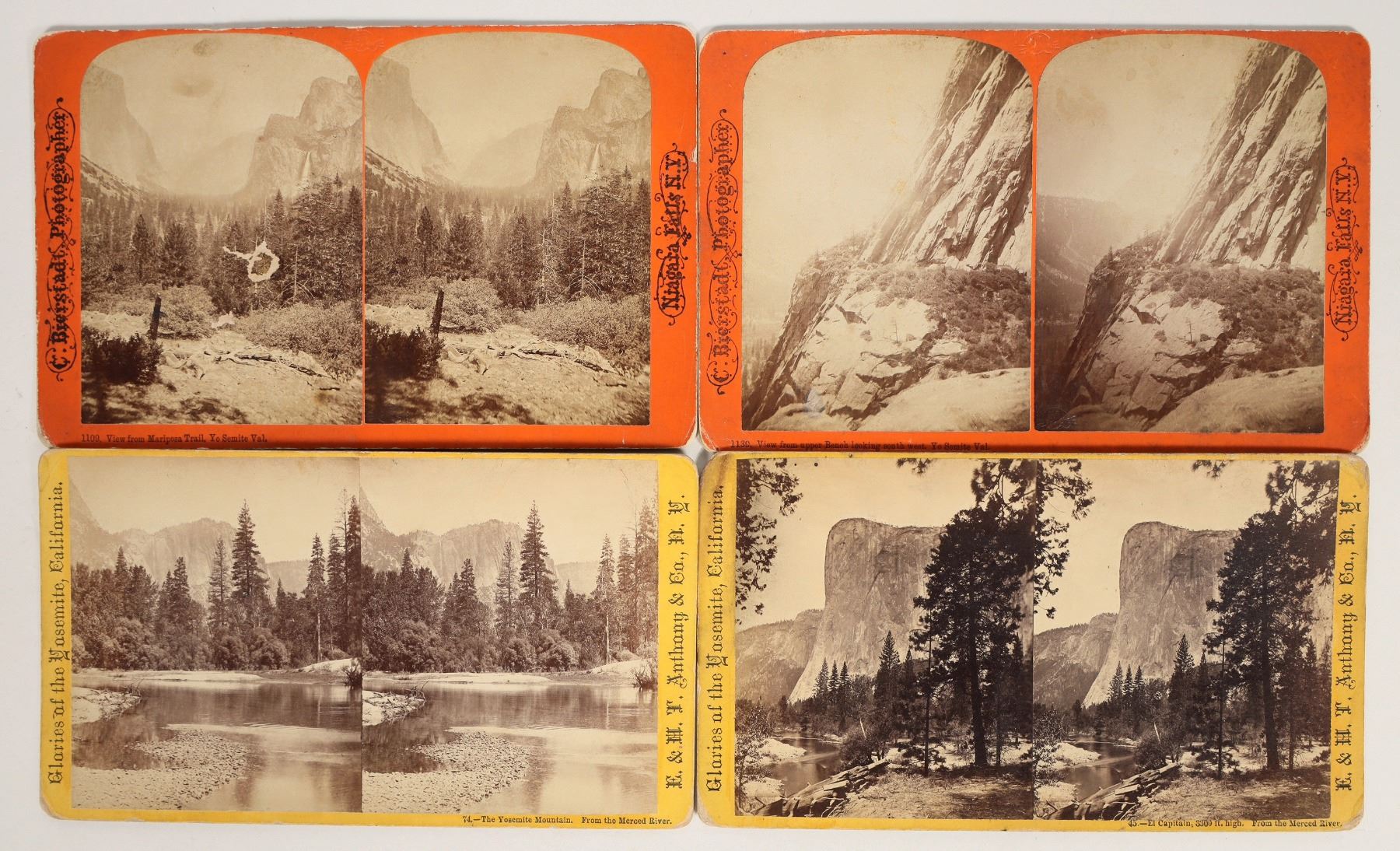 Lot of 4 different Yosemite stereoviews: two by E&HT Anthony & Co., two by C. Bierstadt. Views include: upper bench view from SW, Mariposa Trail, El Capitaine, and Yosemite Mountain from the Merced River. Okay condition; see photos. Anthony financed T. C. Roche's photo expedition to Yosemite! Edward Anthony actually published the first view of Yosemite in 1860 from a photograph taken by C. L. Weed. A good biography can be found in "Pioneer Photographers of the Far West" by Palmquist.