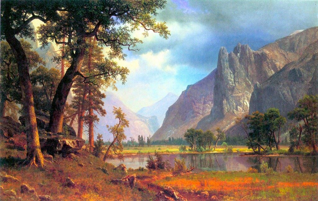 Artist: Albert Bierstadt - Title: Yosemite Valley 2 - Medium: Fine Art Giclee on Canvas - Image Size: Approximately 12.75 inches x 20 inches - Framed: Unframed on Unstretched Canvas - Biography: Bierstadt became internationally renowned for his beautiful and enormous paintings of the newly accessible American west, and his works found their way into public and private collections at staggeringly high prices for his time. His popularity and wealth rose to tremendous heights only to fade as the interest in the Boston School and impressionism turned public taste away from his highly detailed landscapes suffused with golden light. -