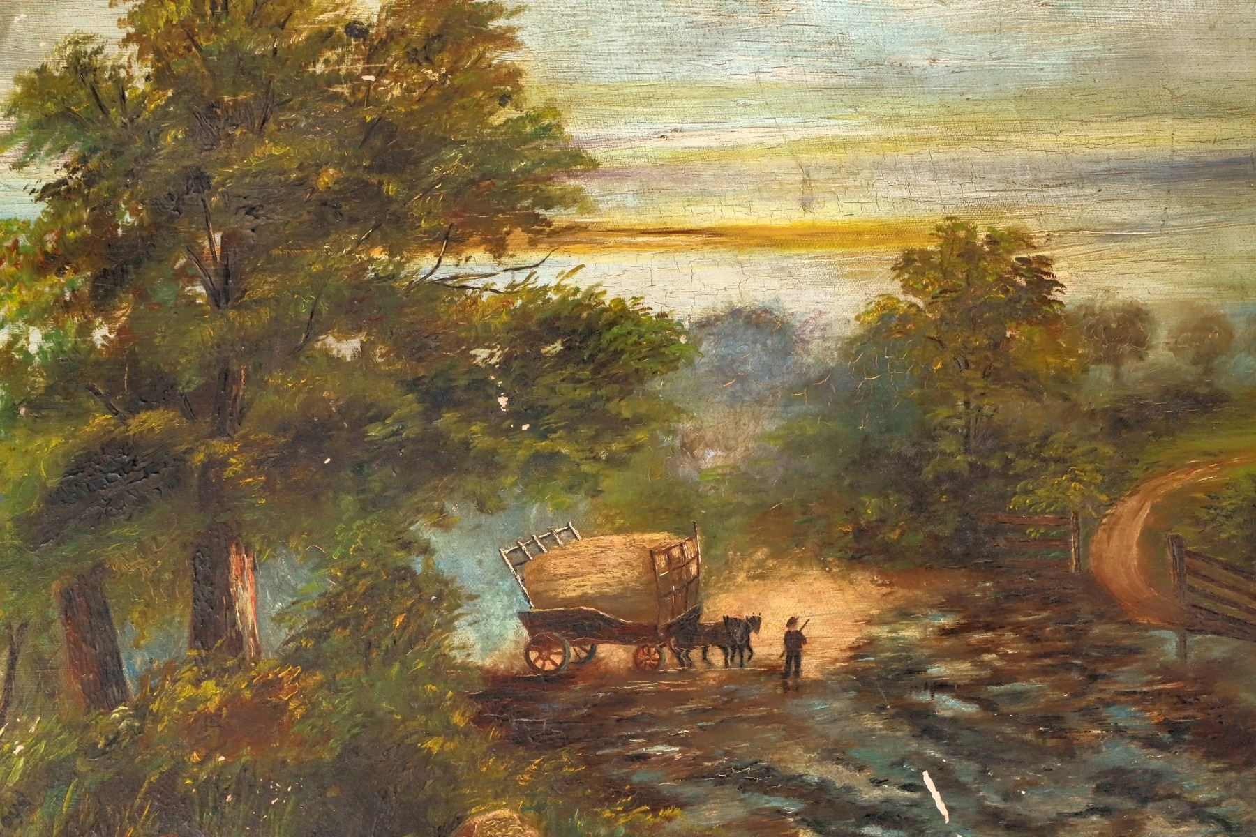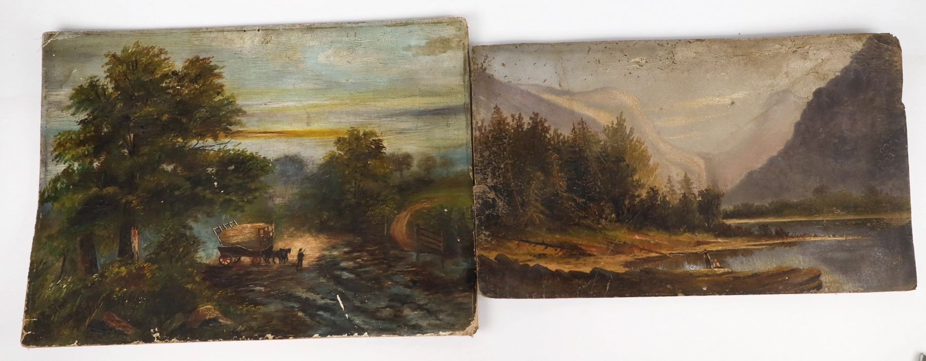 Yosemite Valley Oil Painting c. 1880s. Crude, amateur view of Yosemite Valley on board in need of restoration. 21.5 x 13 inches. No signature. Came with second painting of generic landscape view on board of a similar nature by M. C. Boyd, with paper label on reverse, "Russell's Canvas Board 1879" measuring 22 x 16 inches. Both have water damage. Both were once framed.