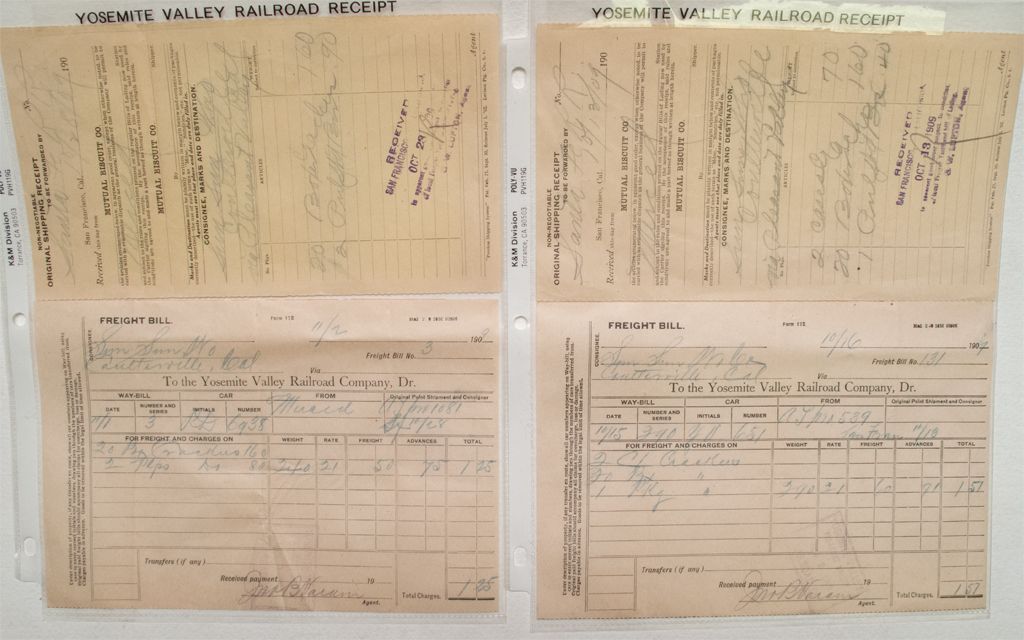 Yosemite Valley Railroad 1907 and 1909 Freight Bills!