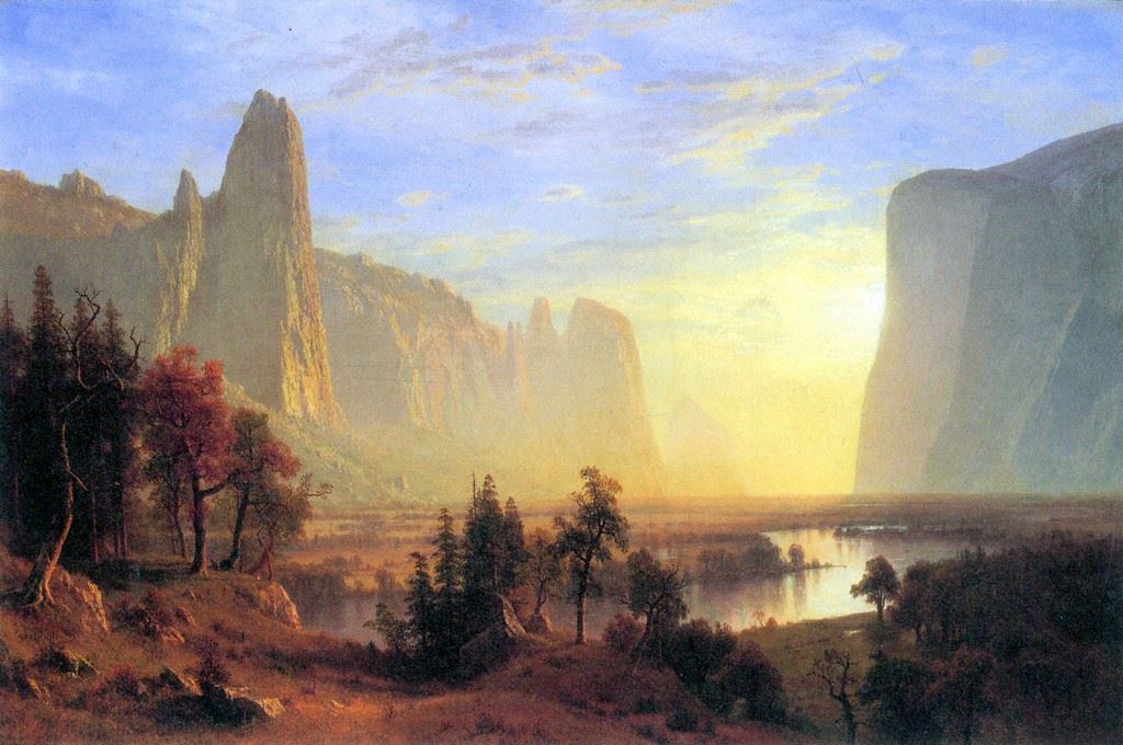 Artist: Albert Bierstadt - Title: Yosemite Valley - Medium: Fine Art Giclee on Canvas - Image Size: Approximately 13.25 inches x 20 inches - Framed: Unframed on Unstretched Canvas - Biography: Bierstadt became internationally renowned for his beautiful and enormous paintings of the newly accessible American west, and his works found their way into public and private collections at staggeringly high prices for his time. His popularity and wealth rose to tremendous heights only to fade as the interest in the Boston School and impressionism turned public taste away from his highly detailed landscapes suffused with golden light. -