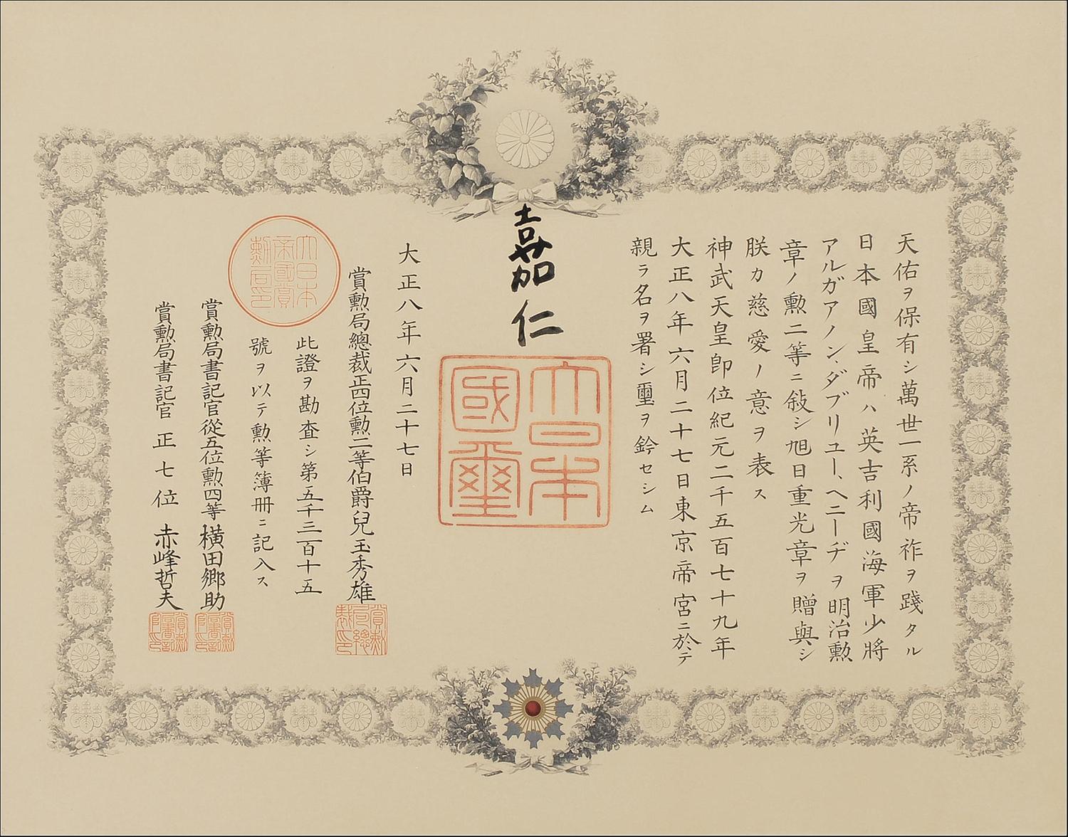 The 123rd Emperor of Japan, according to the traditional order of succession, reigning from July 30, 1912, until his death in 1926. Manuscript DS, in Japanese, one page, 23 x 18, June 27, 1920. The Emporer bestows the Order of the Rising Sun, Second Class, to Rear Admiral Algernon W. Heneage. Document reads (translated):