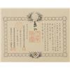The document, affixed to an identical size board, is also signed by Hideo KodamaI, President of the Bureau of Decorations, as well as Gosuke Yokota and Tetsuo Akamine, Secretaries of the Bureau. In fine condition, with a uniform shade of mild toning from previous display.