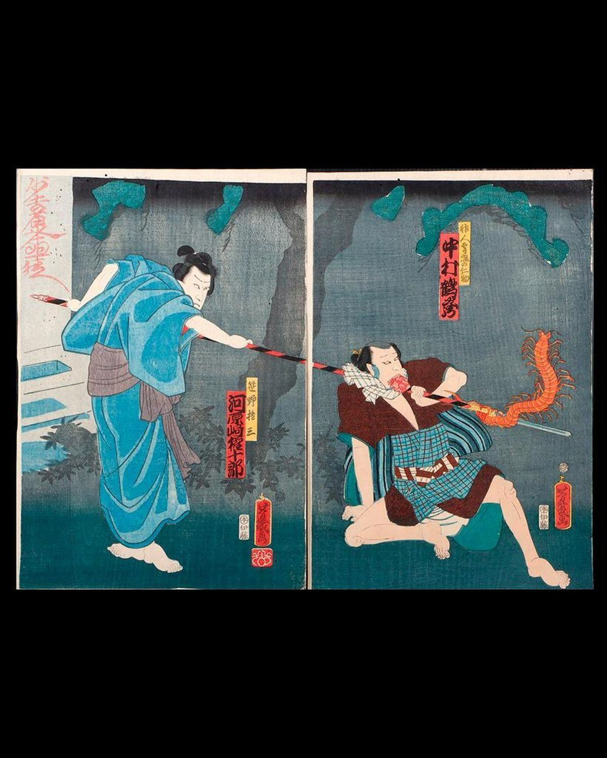Artist :Yoshiku UTAGAWA(1833-1904) Series : Actor KawarazakiGonjuroin the role of Sasano. Date :1863 Medium: Woodblock (diptych) Dimensions : 14 1/2 x 9 3/4 in. Condition : Light fading, small wormholes, and some thinning to paper.