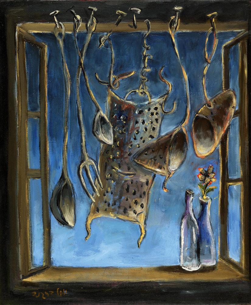 Yosl Bergner, Israeli Art, B. 1920, Still Life in a Window, Oil on canvas, 60x50cm, Signed. Signed again and titled on the reverse., , , , ,