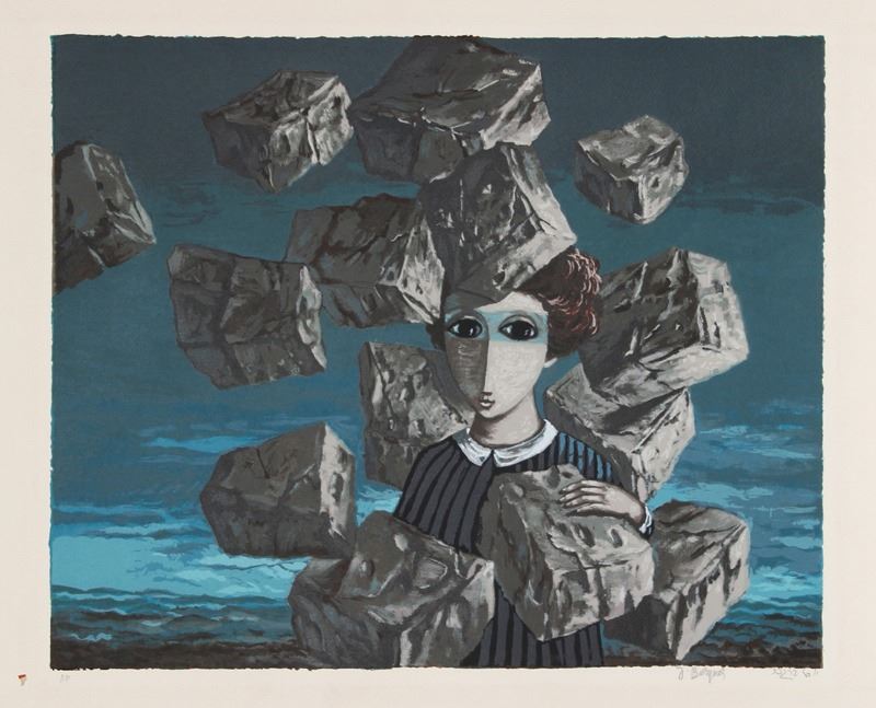 Yosl Bergner, Portrait with Falling Rocks, Lithograph