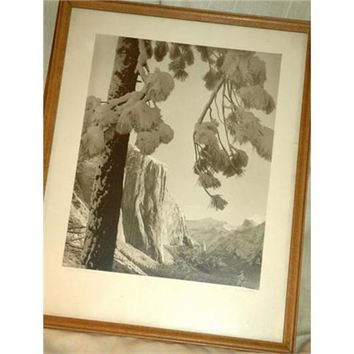 Signed Black and White Photo of Yosemit valley in the winter. The trees are heavy with snow. There is a soft muted tone to the photo, rather then a harsh contrast between the back and white. It very soothing to the eyes to view. it is behind glass in a wood frame measures 11 1.2 x 14 1/2",