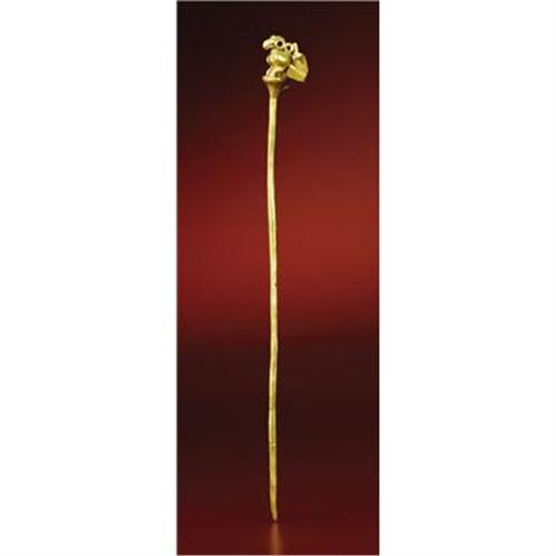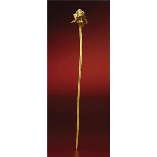 <B>Lime Dipper with Bird Finial</B></I><BR>Yotoco<BR>A.D. 100 - 800<BR>Gold, Weight 40 grams<BR>Height 7 7/8 in. Depth 13/16 in. Height (bird) ¾ in.<BR><BR>An alert-looking bird with curved beak and rippled crest stands on the flared area at the top of the dipper shaft. Beak and crest suggest that this may represent a harpy eagle. Two integrally-cast loops attached on the wings have rectangular sheets of metal foil attached with wires. A small center element curves upward from the back near the base of the tail. Fine lime dippers would have been the prerogative of someone of rank and power. The condition is very good.<BR><BR>Provenance<BR>David Walley, Pontotoc, Mississippi<BR>Christie's Paris, vente: 5068/441<BR><BR>