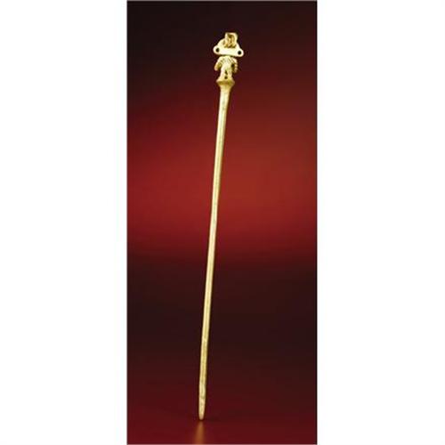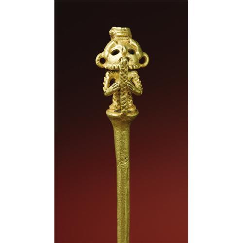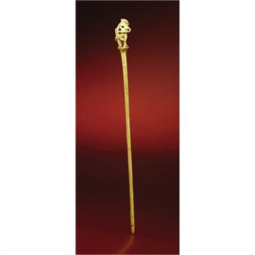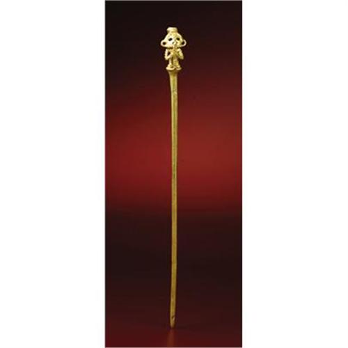 <B>Lime Dipper with Standing Shaman</B></I><BR>Yotoco<BR>A.D. 100 - 800<BR>Gold, Weight 58 grams<BR>Height 10 in. Width 13/16 in. Height (figure) 1 3/8 in.<BR><BR>This cast lime dipper is capped by a standing shaman wearing a large-eyed, open-mouthed mask with a notched lower edge. He has looped ear areas and a high backward-curving cap. He holds a shaman's staff with both hands. he staff and the figure's upper arms, legs, and back are all patterned with incised cross-hatching. Lime dippers were used in connection with gourd or metal containers which held the powdered mineral lime necessary as a catalyst in chewing coca leaves. The dipper tip was moistened so that the requisite small amount of lime would adhere. As the dipper was not polished after casting, the surface is slightly porous in places. Minute dirt residues remain on several parts of the finial image.<BR><BR>Provenance<BR>David Walley, Pontotoc, Mississippi<BR><BR>