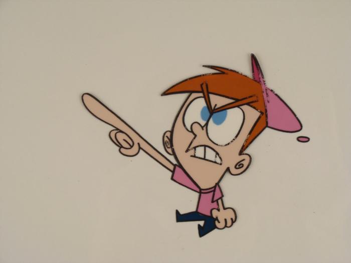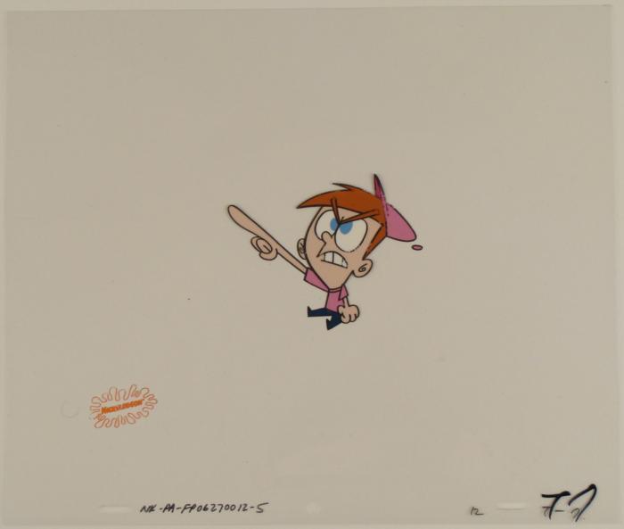 This original animation cel is from the Nickelodeon TV show Fairly Odd Parents. Timmy Turner is a short, buck-toothed 10-year-old boy with a pink cap who lives in Dimmsdale, a small suburban town with his dim-witted parents. His life is constantly miserable, due to the fact that his parents are rarely home and he is babysat by an incredibly evil teenager, Vicky, and that, generally, no one understands him (as indicated by the show's theme song). But everything changes when he receives two fairy parents: Cosmo and his wife, Wanda and later, their son Poof. Timmy learns that his fairy godparents are capable of granting him any wish he wants within certain limits. However, Timmy's immature nature causes him to sometimes ask for wishes that unintentionally result in disaster, and he and his fairy parents and fairy brother must find a way to "unwish" the wish. It was you! I saw you do it! · Original Production Animated Cel · Overall Size of Cel: 10 1/2" x 12 1/2" · Very Good Condition This is an original hand-painted cel set-up used in the production of an episode of "Fairly Odd Parents." Each one-of-a-kind set-up represents a slight change in position of the characters. When individually photographed and projected in rapid succession, the images appear to move.To create production cels, the original animator's drawing is transferred onto an acetate cel (by hand-inking and/or photo copying). The cel is then hand-painted on the reverse side. The cel is ready to be matted and framed. The animator's notations are at the bottom of the cel. Some of the paint to Timmy's outline is fading. There is the Nickelodeon stamp on the bottom left corner of the cel.