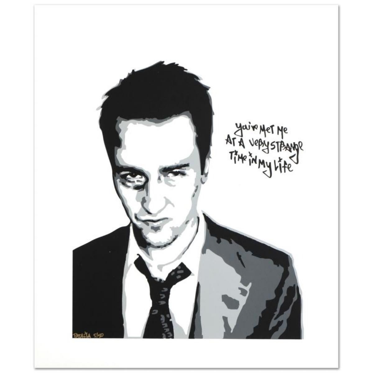 You Met Me at a Very Strange Time (Fight Club) by Avocado, Padhia. "You Met Me at a Very Strange Time" is a limited edition silkscreen serigraph on paper, numbered hand signed by the artist. This piece features Ed Norton from "Fight Club". Includes Certificate of Authenticity! Measures approx. Measures approx. 20" x 24" (with border); 16" x 19" (image).