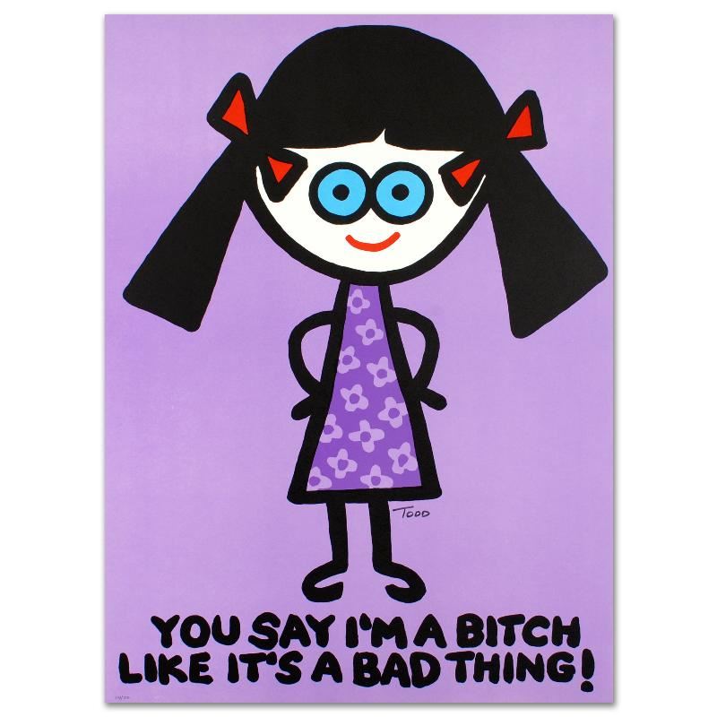 Pop artist Todd Goldman is known all across the globe for his whip-smart and wickedly funny puns and pictures! "You Say I'm a Bitch Like It's a Bad Thing" is a limited edition lithograph on paper, numbered and hand signed by Todd. Includes Certificate of Authenticity! Measures approx. 27" x 37" (no border).