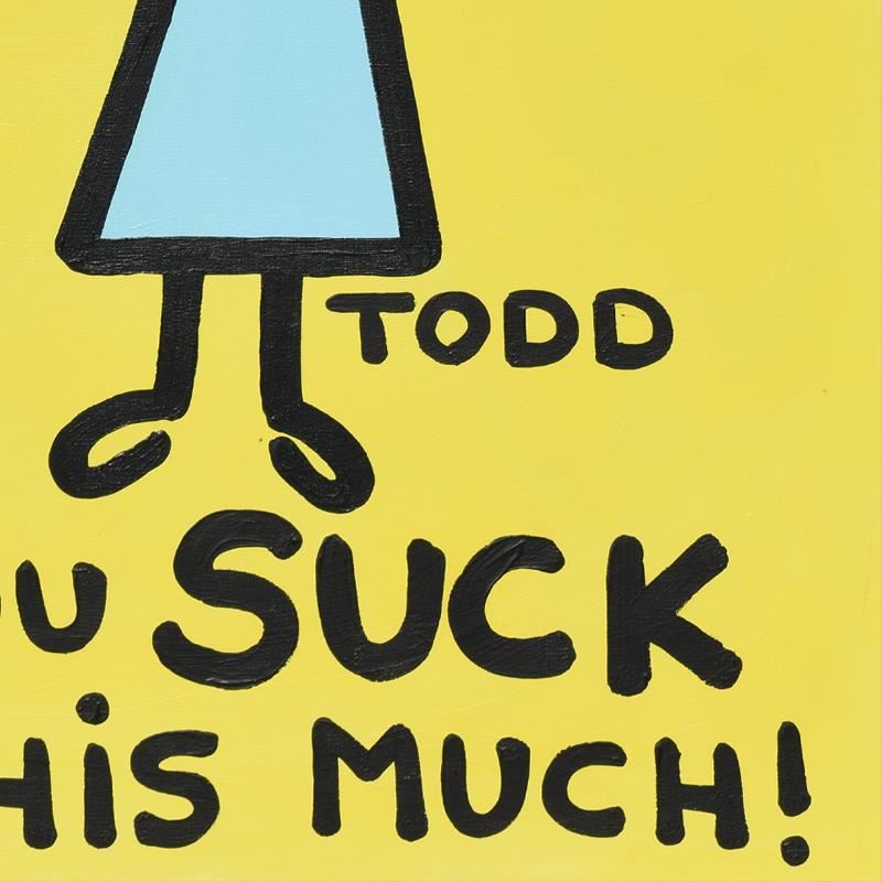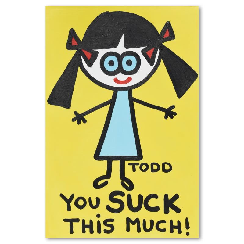 "You Suck" is an original acrylic painting on gallery wrapped canvas by Todd Goldman, hand signed by the artist. Includes Letter of Authenticity. Measures approx. 24" x 36" (image). Due to the way this piece was stored there may be minor wear or signs of age (such as wear on the corners) but the piece is in overall good condition.