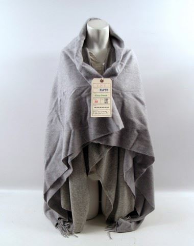 Kate (Hilary Swank) screen worn, hero, light grey long sleeve with shiny silver at the cuffs cashmere 'Josie' sweater with no closure, off-white one button at the neck long sleeve top, and grey with frills at the end large blanket. Includes wardrobe tag!