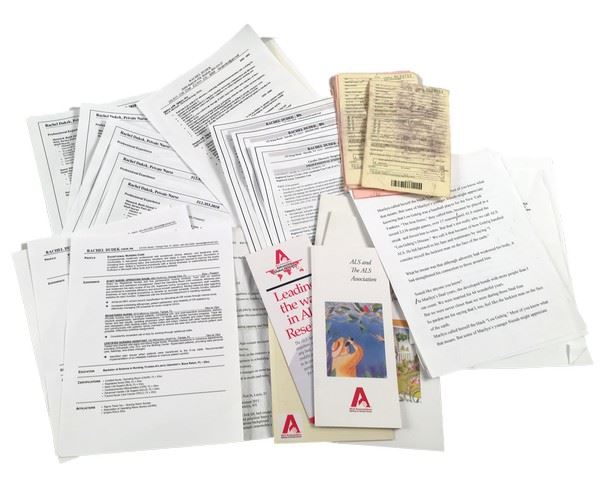 Screen used, hero, Interviewee / Rachel (Roya Semnanian) resumes, Marilyn (Loretta Devine) eulogies, ALS information, and tickets. (approx. 8 1/2" x 11")