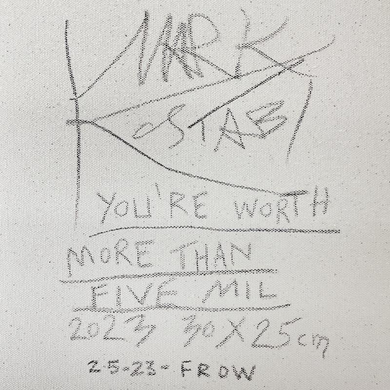 "You're Worth More than Five Mil" is an original oil painting on canvas by Mark Kostabi, hand signed by the artist. Includes Certificate of Authenticity. Measures approx. 12" x 10" (image).