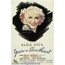 <B>You're a Sweetheart (Universal, 1937)</B></I> One Sheet (27" X 41"). Alice Faye's only musical for Universal tells the tale of a publicity stunt arranged by the producer of a play opening on Broadway. He hires a waiter (George Murphy) to pose as an Oklahoma oilman and take out the star of the play (Faye). Of course, since she doesn't know his real occupation, they end up falling in love. Hijinks and music ensue. This professionally restored one sheet has a gorgeous litho image of Alice Faye. Pinholes, edge chips missing, fold separations with small loss of paper, a piece of tape removed from the back of the center fold, light airbrushing on Faye's forehead. After restoration, the poster has a very clean appearance. Fine on Linen.