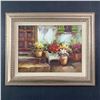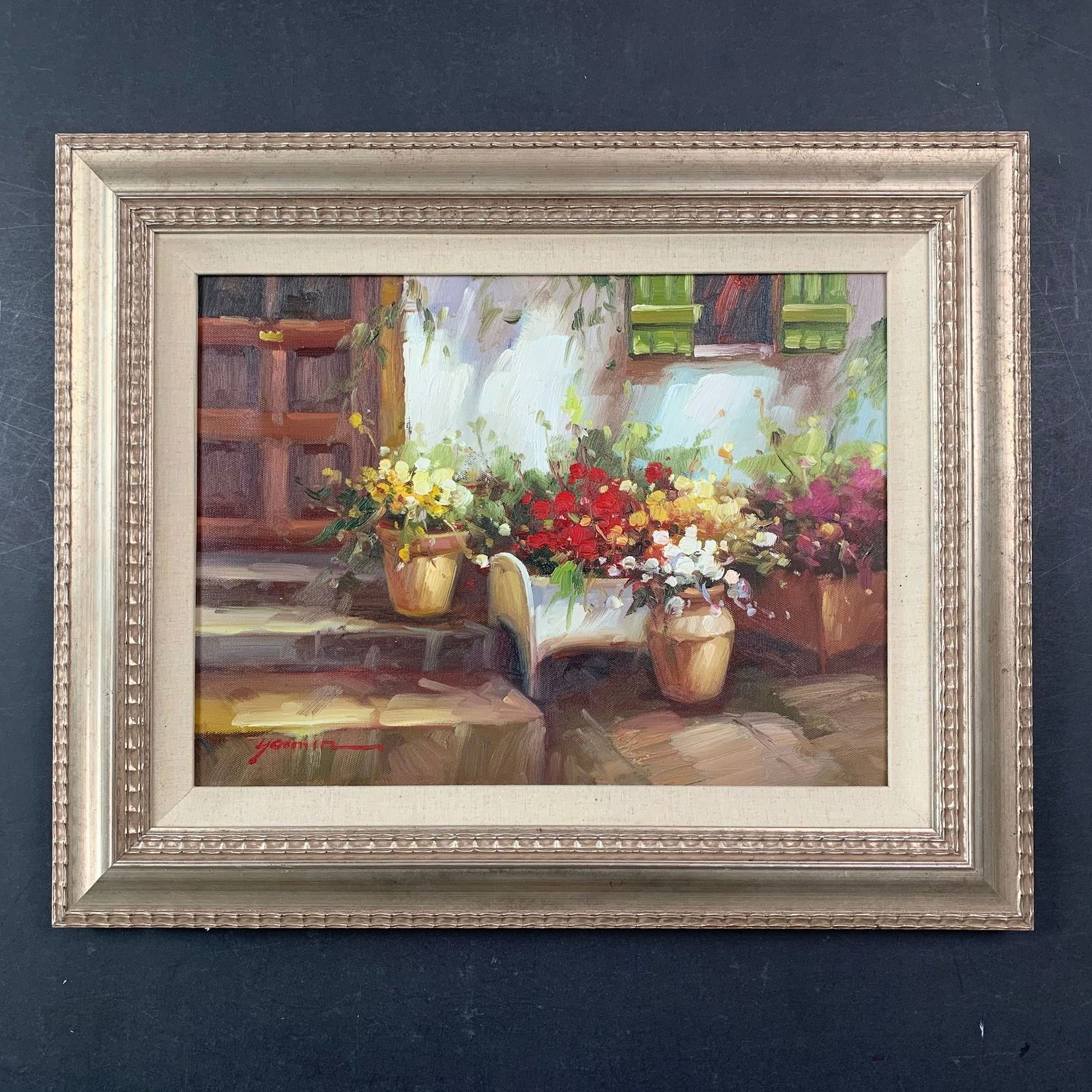 Youmin, Untitled, Framed Original on Canvas. Flower pots are blooming on the porch. White, red and yellow blossoms, overflow the pots. Framed in a gold frame with an oatmeal liner, this piece is in excellent condition.