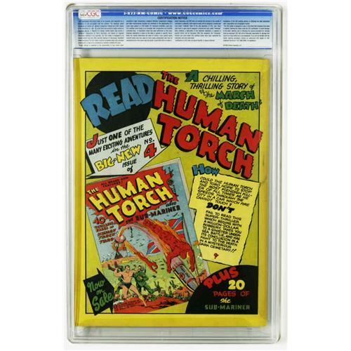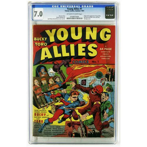 <B>Young Allies Comics #1 (Timely, 1941) CGC FN/VF 7.0 Off-white to white pages.</B></I> Bucky and Toro give Hitler and the Red Skull what for on this incredible cover by Jack Kirby and Syd Shores (usually credited to Joe Simon and Jack Kirby). The cover art had originally featured Stalin in the Red Skull's place, and was shown that way in a preview in <B>Human Torch</B></I> #5, but was changed before publication due to Russia joining the Allied Forces at the start of World War II. The Young Allies team makes its first appearance and has its origin featured in this issue, which sports art by Kirby (who drew the first page of every chapter), Shores, and Charles Nicholas. This book comes in at number 48 in Overstreet's 2005 Top Golden Age Books list. Overstreet 2005 FN 6.0 value = $4,059; VF 8.0 value = $10,148. CGC census 11/05: 2 in 7.0, 8 higher.