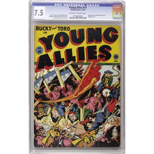 <B>Young Allies Comics #10 (Timely, 1943) CGC VF- 7.5 Off-white to white pages.</B></I> In addition to Young Allies action (rendered superbly on the cover by Alex Schomburg) this issue has the origin of time-traveling youngster Tommy Tyme. Overstreet 2006 VF 8.0 value = $881. CGC census 10/06: 1 in 7.5, 6 higher.<BR><BR><b>Shipping:</b> Slabbed Comic (<a target="_blank" href="http://www.heritageauctions.com/common/shipping.php">view shipping information</a>)