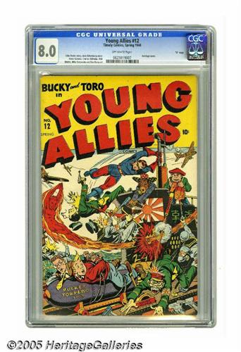 <B>Young Allies Comics #12 "D" Copy pedigree (Timely, 1944) CGC VF 8.0 Off-white pages.</B></I> It's a good thing the Boys and their Japanese adversaries were using rubber bullets, because so many point-blank shots could really be messy! Alex Schomburg crams this cover brim-full of action, and Charles Nicholas, Dick Briefer, Mike Sekowsky, and Dan Barry contribute interior art. This nice pedigree book is just the second (and nicest!) copy to be certified by CGC to date. Overstreet 2005 VF 8.0 value = $638. CGC census 7/05: 1 in 8.0, none higher.