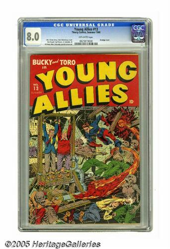 <B>Young Allies Comics #13 (Timely, 1944) CGC VF 8.0 Off-white pages.</B></I> Pretty copy, one of just four unrestored copies that CGC has certified to date, only one of which beats our offering in grade. Top echelon artists working the interior (Bob Powell, Syd Shores, Al Gabriele, Mike Sekowsky, and Al Avison) are as numerous as the characters packed into Alex Schomburg's cover, which features bondage, torture... you know, the usual fun stuff! Overstreet 2005 VF 8.0 value = $638. CGC census 7/05: 1 in 8.0, 1 higher.