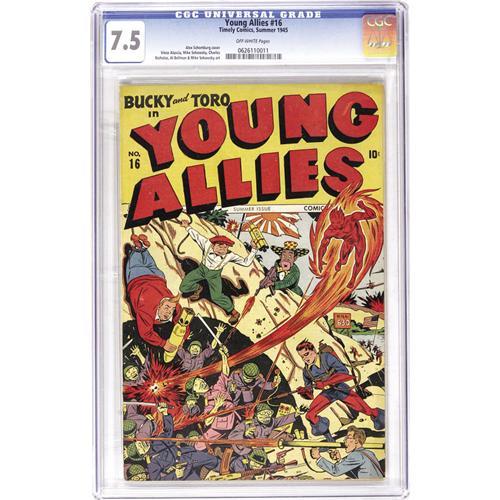 <B>Young Allies Comics #16 (Timely, 1945) CGC VF- 7.5 Off-white pages.</B></I> The Young Allies are assisted by Toro and Bucky on this action-packed Alex Schomburg cover. The story art comes from Charles Nicholas, Vince Alascia, and Mike Sekowsky. Overstreet 2006 VF 8.0 value = $650. CGC census 7/06: 1 in 7.5, 3 higher. <BR><BR><B>Important notice:</B> Heritage usually auctions material at the rate of 200-250 lots per hour. On some occasions eBay Live bid software or the Internet may not be able to keep up with the pace of the auction. We recommend placing a realistic absentee bid now as insurance to avoid disappointment. Occasionally the auctioneer may eliminate or reject an eBay Live bid, and the auctioneer may also reopen a lot after the close of the eBay live bidding (usually because we missed an audience bid), and may reject your bid even if it shows you as the winning bidder. By bidding via eBay Live, you agree that Heritage may award the lot to another bidder at its sole discretion under the circumstances described above or any other reasonable circumstances. Since eBay bids are not shown to us until we open the lot on the floor, we treat those bids just like floor bids. In most cases the floor responds before the eBay bid is presented to us, due to Internet lag time, so for consistency we have made it a policy that floor bids are always considered first over tie eBay live bids. Also please note that all Heritage lots purchased through eBay Live carry a 22.5% Buyer's Premium. Please make sure you read the Terms and Conditions before you bid. This lot is being auctioned in conjunction with a live floor auction by Heritage Auction Galleries. All final auction and invoice information will be supplied by Heritage Auction Galleries, and all other information should be considered preliminary. Lot:41001 <BR><BR><B>Winning Notification and Billing:</B> After the FINAL session in this auction is complete, Heritage will send e-mail and snail mail invoices. This process normally takes several days. All final auction and invoice information will be supplied by Heritage Auction Galleries, and all other information should be considered preliminary. <BR><BR>This auction will be conducted on a live auction floor and over the Internet through eBay Live. If you choose to place an absentee bid, please take a moment to <font color='#0000ff'><u><a href='http://pages.ebay.com/liveauctions/help/before/laabsentee.html'>learn how eBay Live absentee bidding works</a></u></font><font color='#000000'>