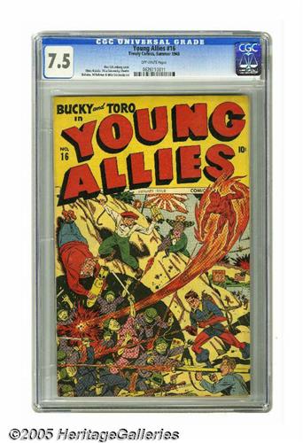 <B>Young Allies Comics #16 (Timely, 1945) CGC VF- 7.5 Off-white pages.</B></I> The orthodontically-challenged Japanazis, though numerous, are no match for the TNT, the bomb, the flamethrower, the tommygun, and the bazooka fire served by the six lads known as the Young Allies! It could only be an Alex Schomburg cover! Story art comes from Charles Nicholas, Vince Alascia, and Mike Sekowsky. Overstreet 2005 VF 8.0 value = $638. CGC census 7/05: 1 in 7.5, 3 higher.