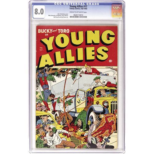 <B>Young Allies Comics #17 (Timely, 1945) CGC VF 8.0 Cream to off-white pages.</B></I> Another busy cover by Alex Schomburg features the Young Allies defending a truck-full of cigarettes against what appear to be mobsters. With the aid of Bucky and Toro, America will once again be "cool and mild." Interior art is furnished by Syd Shores, Vince Alascia, and Mike Sekowsky. Overstreet 2006 VF 8.0 value = $650. CGC census 7/06: 1 in 8.0, 5 higher. <BR><BR><B>Important notice:</B> Heritage usually auctions material at the rate of 200-250 lots per hour. On some occasions eBay Live bid software or the Internet may not be able to keep up with the pace of the auction. We recommend placing a realistic absentee bid now as insurance to avoid disappointment. Occasionally the auctioneer may eliminate or reject an eBay Live bid, and the auctioneer may also reopen a lot after the close of the eBay live bidding (usually because we missed an audience bid), and may reject your bid even if it shows you as the winning bidder. By bidding via eBay Live, you agree that Heritage may award the lot to another bidder at its sole discretion under the circumstances described above or any other reasonable circumstances. Since eBay bids are not shown to us until we open the lot on the floor, we treat those bids just like floor bids. In most cases the floor responds before the eBay bid is presented to us, due to Internet lag time, so for consistency we have made it a policy that floor bids are always considered first over tie eBay live bids. Also please note that all Heritage lots purchased through eBay Live carry a 22.5% Buyer's Premium. Please make sure you read the Terms and Conditions before you bid. This lot is being auctioned in conjunction with a live floor auction by Heritage Auction Galleries. All final auction and invoice information will be supplied by Heritage Auction Galleries, and all other information should be considered preliminary. Lot:41001 <BR><BR><B>Winning Notification and Billing:</B> After the FINAL session in this auction is complete, Heritage will send e-mail and snail mail invoices. This process normally takes several days. All final auction and invoice information will be supplied by Heritage Auction Galleries, and all other information should be considered preliminary. <BR><BR>This auction will be conducted on a live auction floor and over the Internet through eBay Live. If you choose to place an absentee bid, please take a moment to <font color='#0000ff'><u><a href='http://pages.ebay.com/liveauctions/help/before/laabsentee.html'>learn how eBay Live absentee bidding works</a></u></font><font color='#000000'>