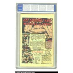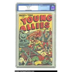 Young Allies Comics #18 (Timely, 1945) CGC VF+ 8.5 Off-white pages. Moments before two members are diced under the oncoming train, the rest of the Young Allies swoop in for the last-minute rescue, thwarting the gun-toting bad guys from carrying out their bloody deed. A small abrasion at the bottom of the spine, and a bit of staple discoloration account for the only visible defects on this otherwise gorgeous, high-grade copy. Only one other copy has currently been given a higher grade by CGC than this one. Overstreet 2003 VF 8.0 value = $600; VF/NM 9.0 value = $850. Important notice: Heritage usually auctions material at the rate of 200-250 lots per hour. On some occasions eBay Live bid software or the Internet may not be able to keep up with the pace of the auction. We recommend placing a realistic absentee bid now as insurance to avoid disappointment. Occasionally the auctioneer may eliminate or reject an eBay Live bid, and the auctioneer may also reopen a lot after the close of the eBay live bidding (usually because we missed an audience bid), and may reject your bid even if it shows you as the winning bidder. By bidding via eBay Live, you agree that Heritage may award the lot to another bidder at its sole discretion under the circumstances described above or any other reasonable circumstances. Also please note that all Heritage lots purchased through eBay Live carry a 20% Buyer's Premium. Please make sure you read the Terms and Conditions before you bid.