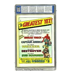 <B>Young Allies Comics #2 (Timely, 1941) CGC VF/NM 9.0 Cream to off-white pages.</B></I> The Young Allies were a boy's dream come true -- they were only kids themselves, yet they fought the Nazi menace just like the grown-ups did. Simon and Kirby, who created the team, drew this issue's cover which shows some "Timely" intervention by our heroes. Inside the comic, Captain America and the Human Torch appear. Sixty-three years later, the Young Allies of yore are in AARP, but this comic still has the look of a spring chicken at VF/NM. It's no surprise that this is the highest grade that CGC has assigned for this issue to date. Overstreet 2004 VF/NM 9.0 value = $3,703; NM- 9.2 value = $5,000. <BR><BR><B>Important notice:</B> Heritage usually auctions material at the rate of 200-250 lots per hour. On some occasions eBay Live bid software or the Internet may not be able to keep up with the pace of the auction. We recommend placing a realistic absentee bid now as insurance to avoid disappointment. Occasionally the auctioneer may eliminate or reject an eBay Live bid, and the auctioneer may also reopen a lot after the close of the eBay live bidding (usually because we missed an audience bid), and may reject your bid even if it shows you as the winning bidder. By bidding via eBay Live, you agree that Heritage may award the lot to another bidder at its sole discretion under the circumstances described above or any other reasonable circumstances. Since eBay bids are not shown to us until we open the lot on the floor, we treat those bids just like floor bids. In most cases the floor responds before the eBay bid is presented to us, due to Internet lag time, so for consistency we have made it a policy that floor bids are always considered first over tie eBay live bids. Also please note that all Heritage lots purchased through eBay Live carry a 20% Buyer's Premium. Please make sure you read the Terms and Conditions before you bid.