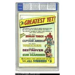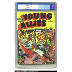 Young Allies Comics #2 (Timely, 1941) CGC VF/NM 9.0 Off-white pages. This smashing cover stars Bucky, Toro, and the rest of the Young Allies, drawn with verve and flair by Joe Simon and Jack Kirby. Captain America and the Human Torch appear inside, giving the young lads some much-needed adult supervision. This bright, gorgeous comic is tied with one other copy for CGC's highest grade, to date, for issue #2. And if that's not enough excitement for you, the back cover has a cool full-page ad for All Winners #3. Overstreet 2003 VF/NM 9.0 value = $3,375; NM 9.4 value = $4,500. Important notice: Heritage usually auctions material at the rate of 200-250 lots per hour. On some occasions eBay Live bid software or the Internet may not be able to keep up with the pace of the auction. We recommend placing a realistic absentee bid now as insurance to avoid disappointment. Occasionally the auctioneer may eliminate or reject an eBay Live bid, and the auctioneer may also reopen a lot after the close of the eBay live bidding (usually because we missed an audience bid), and may reject your bid even if it shows you as the winning bidder. By bidding via eBay Live, you agree that Heritage may award the lot to another bidder at its sole discretion under the circumstances described above or any other reasonable circumstances. Also please note that all Heritage lots purchased through eBay Live carry a 20% Buyer's Premium. Please make sure you read the Terms and Conditions before you bid.