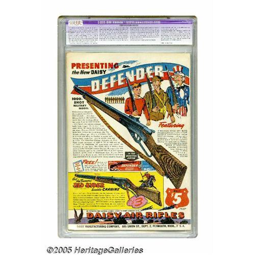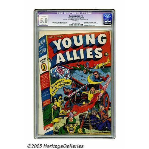 <B>Young Allies Comics #3 (Timely, 1942) CGC Apparent VG/FN 5.0 Slight (A) White pages.</B></I> This classic ""Remember Pearl Harbor"" issue is on everybody's want list. Father Time, Captain America, and the Human Torch appear in this book-length epic. The creative faux book-cover image gave Stan Lee (a shy, retiring type if there ever was one) the opportunity to put his name on the cover (along with that of artist Al Gabriele). CGC notes, ""Restoration includes: spine split sealed, small chip re-attached to cover."" Overstreet 2005 GD 2.0 value = $296; VG 4.0 value = $592; FN 6.0 value = $888. <BR><BR><B>Important notice:</B> Heritage usually auctions material at the rate of 200-250 lots per hour. On some occasions eBay Live bid software or the Internet may not be able to keep up with the pace of the auction. We recommend placing a realistic absentee bid now as insurance to avoid disappointment. Occasionally the auctioneer may eliminate or reject an eBay Live bid, and the auctioneer may also reopen a lot after the close of the eBay live bidding (usually because we missed an audience bid), and may reject your bid even if it shows you as the winning bidder. By bidding via eBay Live, you agree that Heritage may award the lot to another bidder at its sole discretion under the circumstances described above or any other reasonable circumstances. Since eBay bids are not shown to us until we open the lot on the floor, we treat those bids just like floor bids. In most cases the floor responds before the eBay bid is presented to us, due to Internet lag time, so for consistency we have made it a policy that floor bids are always considered first over tie eBay live bids. Also please note that all Heritage lots purchased through eBay Live carry a 20% Buyer's Premium. Please make sure you read the Terms and Conditions before you bid. This lot is being auctioned in conjunction with a live floor auction by Heritage Galleries & Auctioneers. All final auction and invoice information