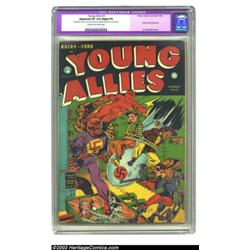 Young Allies Comics #4 (Timely, 1942) CGC Apparent VF 8.0 Slight (P) Cream to off-white pages. A classic Red Skull cover, plus appearances by Captain America and the Human Torch make this a great Golden Age comic. Timely issues this nice don't take long to find a new home, so have that winning bid ready! CGC notes, "Restoration includes: color touch, cover and centerfold reinforced, cover cleaned." Overstreet 2003 GD 2.0 value = $376; VG 4.0 value = $752; FN 6.0 value = $1,128; VF 8.0 value = $2,350. Important notice: Heritage usually auctions material at the rate of 200-250 lots per hour. On some occasions eBay Live bid software or the Internet may not be able to keep up with the pace of the auction. We recommend placing a realistic absentee bid now as insurance to avoid disappointment. Occasionally the auctioneer may eliminate or reject an eBay Live bid, and the auctioneer may also reopen a lot after the close of the eBay live bidding (usually because we missed an audience bid), and may reject your bid even if it shows you as the winning bidder. By bidding via eBay Live, you agree that Heritage may award the lot to another bidder at its sole discretion under the circumstances described above or any other reasonable circumstances. Also please note that all Heritage lots purchased through eBay Live carry a 20% Buyer's Premium. Please make sure you read the Terms and Conditions before you bid.