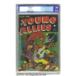 Young Allies Comics #4 (Timely, 1942) CGC VF 8.0 Cream to off-white pages. A classic Red Skull cover is on display here; Al Gabrielle's cover art is absolutely nightmarish, with danger coming from every direction. The cover's black masthead background is deep and rich, the colors bright and vibrant. CGC's grade appears dead-on, if not a bit conservative. The Vagabond, Captain America, the Human Torch, and the Red Skull appear in this issue, in addition to the Young Allies (of course). There are currently only two copies of this issue that have been graded higher by CGC. Overstreet 2003 NM 9.4 value = $2,350. Important notice: Heritage usually auctions material at the rate of 200-250 lots per hour. On some occasions eBay Live bid software or the Internet may not be able to keep up with the pace of the auction. We recommend placing a realistic absentee bid now as insurance to avoid disappointment. Occasionally the auctioneer may eliminate or reject an eBay Live bid, and the auctioneer may also reopen a lot after the close of the eBay live bidding (usually because we missed an audience bid), and may reject your bid even if it shows you as the winning bidder. By bidding via eBay Live, you agree that Heritage may award the lot to another bidder at its sole discretion under the circumstances described above or any other reasonable circumstances. Since eBay bids are not shown to us until we open the lot on the floor, we treat those bids just like floor bids. In most cases the floor responds before the eBay bid is presented to us, due to Internet lag time, so for consistency we have made it a policy that floor bids are always considered first over tie eBay live bids. Also please note that all Heritage lots purchased through eBay Live carry a 20% Buyer's Premium. Please make sure you read the Terms and Conditions before you bid.