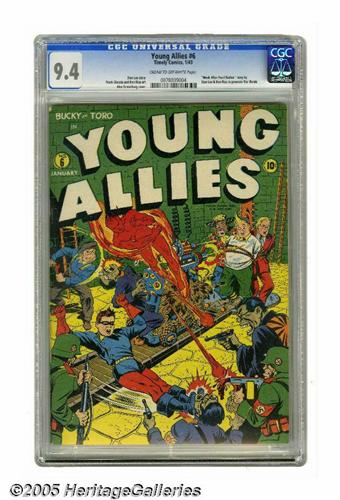 <B>Young Allies Comics #6 (Timely, 1943) CGC NM 9.4 Cream to off-white pages.</B></I> Timely's kid heroes have to take on Japanese <I>and</B></I> Nazis on this Alex Schomburg cover! Among the stories in the issue is a tale to promote war bonds, entitled "The Week After Pearl Harbor." Overstreet 2005 NM- 9.2 value = $1,750. CGC census 5/05: 1 in 9.4, none higher.